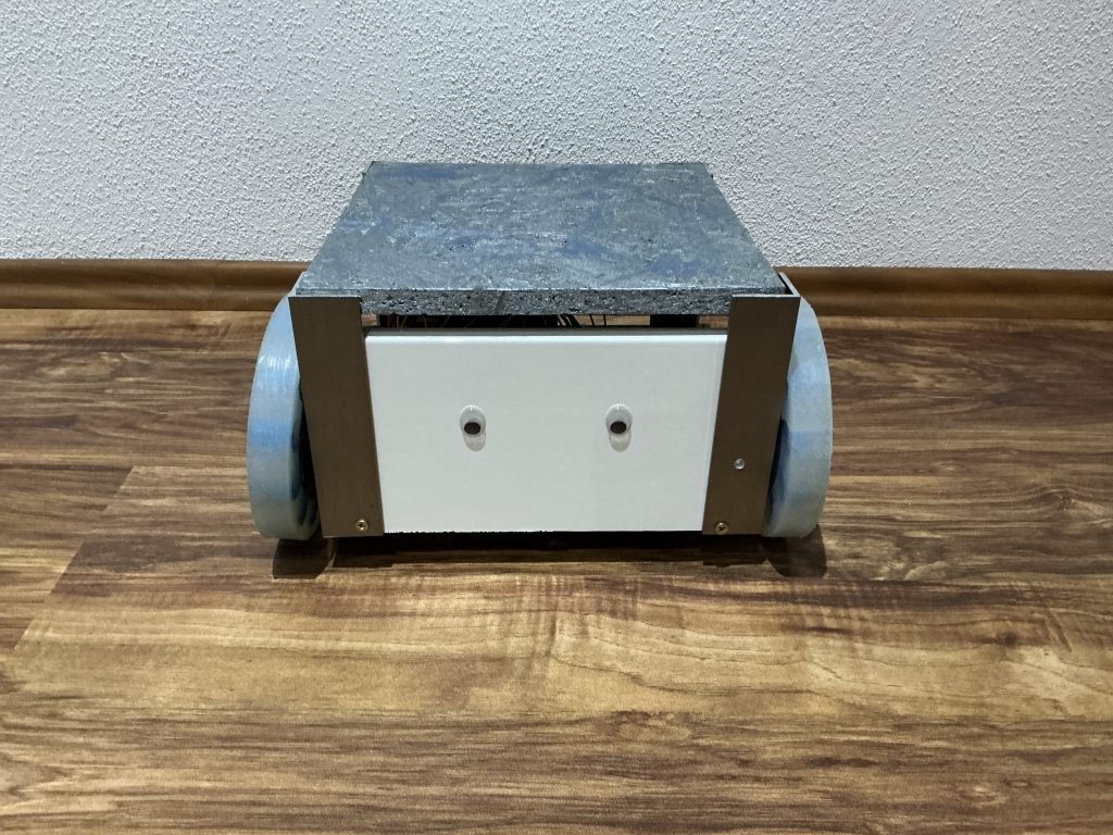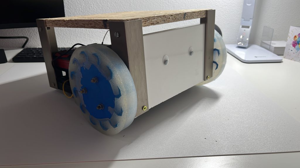 One of our problems was mounting the motors on the underside of the board. During the week, we moved them to the top of the plate and rearranged the entire setup a bit. On the underside, we screwed two small ball casters to the back, which now serve as support wheels. We also built a second level. First, we cut steel brackets to size and drilled holes in the appropriate places. We attached them to the base plate at all four corners of the robot and screwed bolts with nuts onto the top. We then cut the upper board to the appropriate length so that it rests on the bolts and can be easily removed. Additionally, we attached the first piece of paneling at the front.
