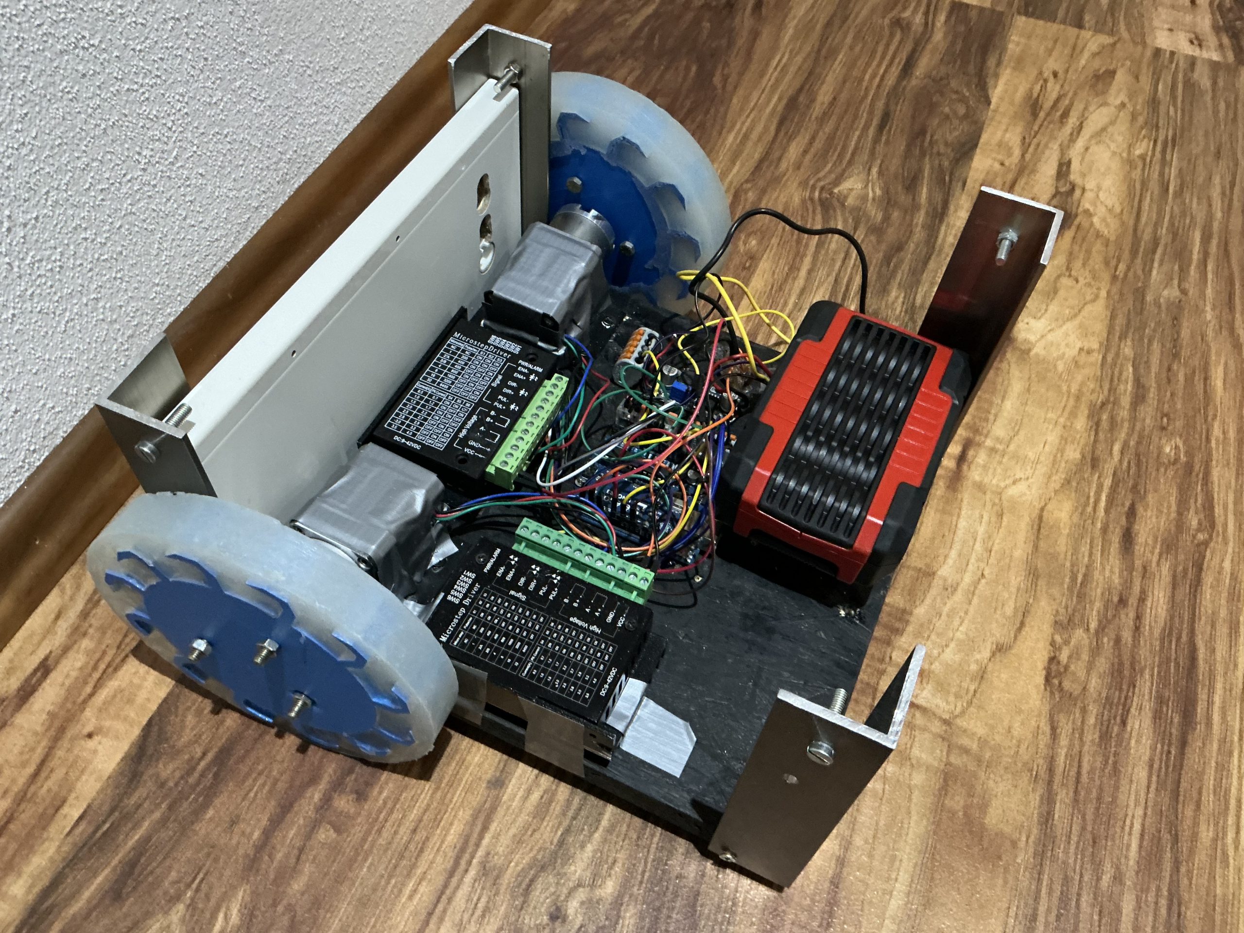 One of our problems was mounting the motors on the underside of the board. During the week, we moved them to the top of the plate and rearranged the entire setup a bit. On the underside, we screwed two small ball casters to the back, which now serve as support wheels. We also built a second level. First, we cut steel brackets to size and drilled holes in the appropriate places. We attached them to the base plate at all four corners of the robot and screwed bolts with nuts onto the top. We then cut the upper board to the appropriate length so that it rests on the bolts and can be easily removed. Additionally, we attached the first piece of paneling at the front.
